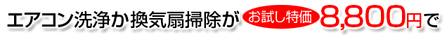 エアコン(壁掛けタイプ)分解クリーニングもしくは換気扇掃除のどちらか1ヶ所が初回ご依頼の方に限りお試し特価の8,800円(通常価格16,200円)で承ります。